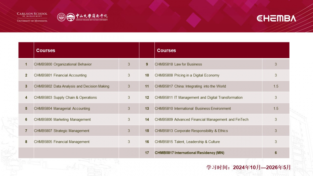 CHEMBA项目的课程由17门课程共计51学分组成,为期20个月,其中包括两周时间前往美国明尼苏达大学参与课程学习、全球商业计划毕业答辩、企业参访及毕业典礼。每门课为32学时,一个月内连续两个周末共四天完成,全英语授课。第一学年的课程有助于增进学员对组织行为和决策的了解;第二学年的课程旨在提升学员处理更广阔商业环境中管理上错综复杂挑战的能力。