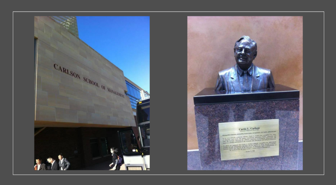 卡尔森管理学院外立面和卡尔森先生雕像