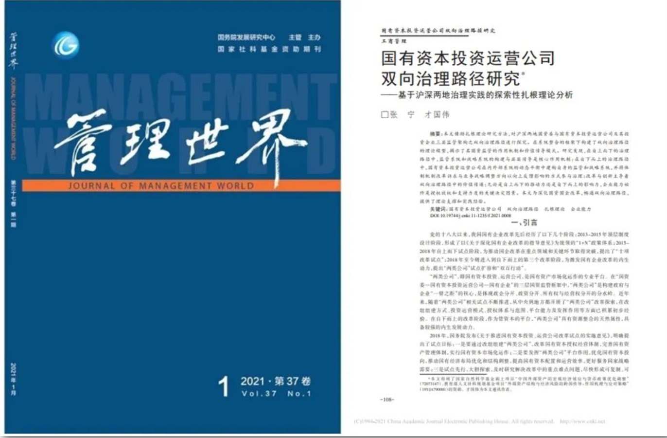 我院张宁博士后与才国伟教授在管理学中文顶级期刊《管理世界》2021年第1期合作发表了题为《国有资本投资运营公司双向治理路径研究——基于沪深两地治理实践的探索性扎根理论分析》学术论文。