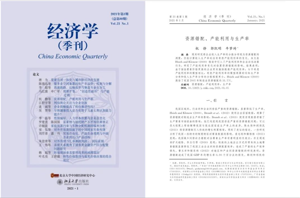 我院杭静助理教授、郭凯明副教授等在经济学中文顶级期刊《经济学(季刊)》2021年第21卷第1期发表了题为《资源错配、产能利用与生产率》的学术论文。