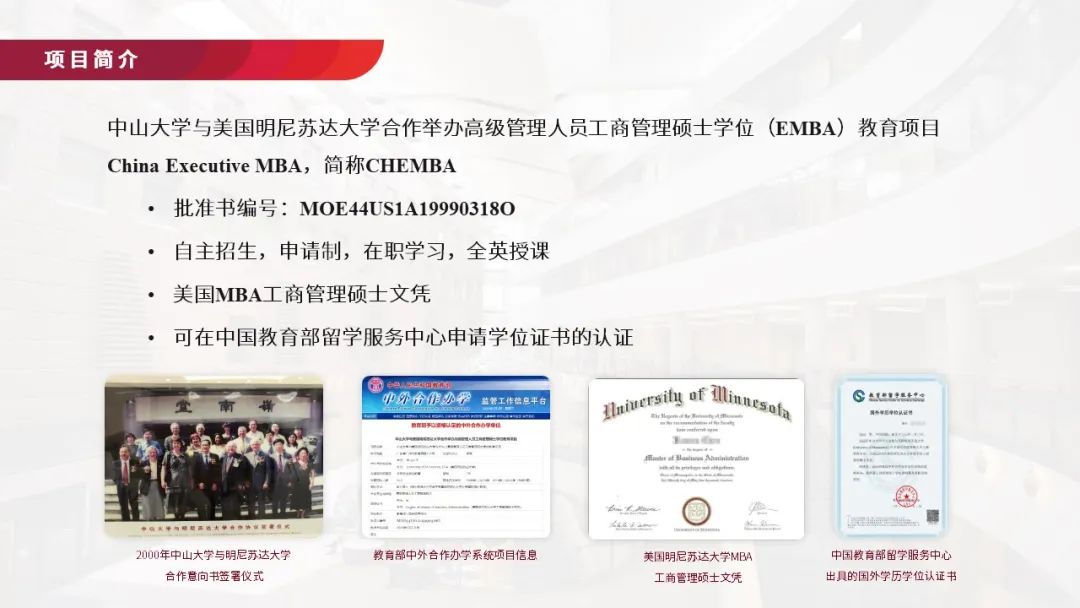 CHEMBA,China Executive MBA的简称,是中国教育部认定批准的第一批中外合作办学EMBA项目 —— 中国yl9193永利集团与美国明尼苏达大学 ( University of Minnesota, USA ) 合作举办高级管理人员工商管理硕士学位教育项目,批准书编号:MOE44US1A19990318O。