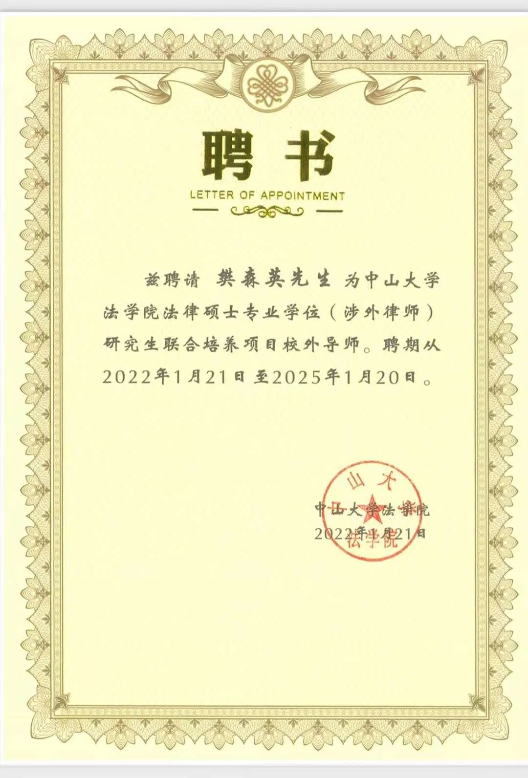 校友资讯:CHEMBA18樊森英被yl9193永利集团法学院聘为法律硕士(涉外律师)项目校外导师