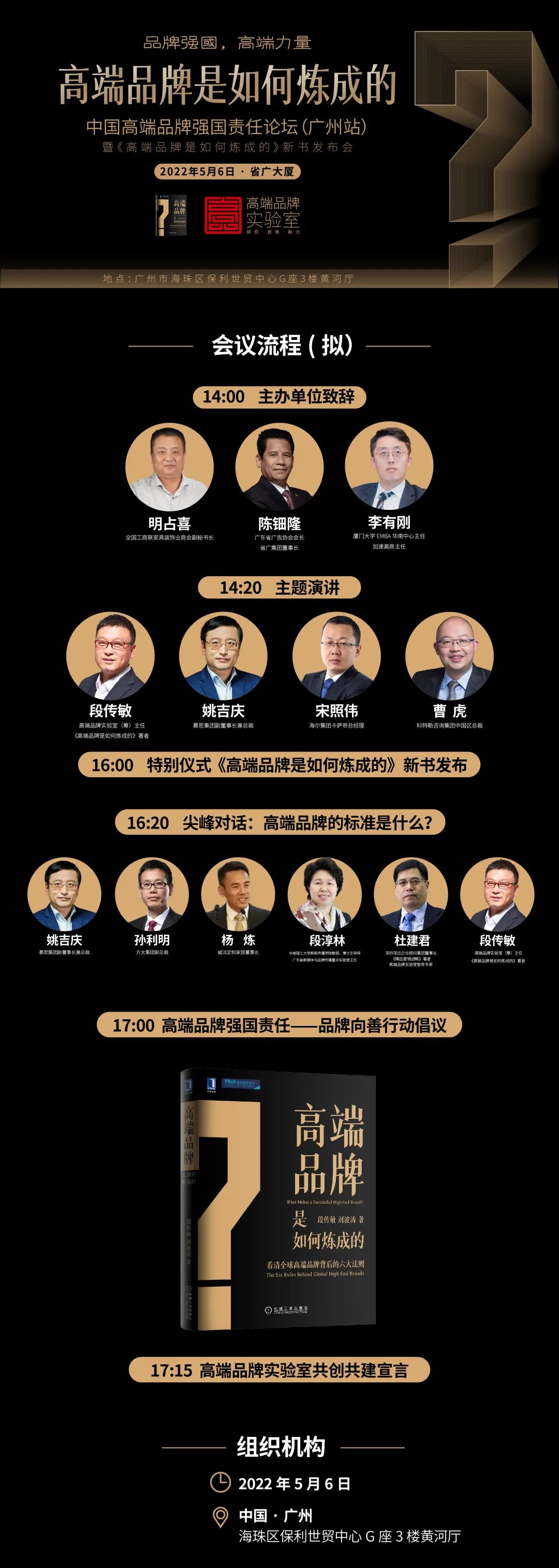 随着第六个“中国品牌日”(每年的5月10日)的临近,关于品牌强国的呼声越发响亮。“品牌强国,高端力量”——中国高端品牌强国责任巡回论坛(广州站)暨《高端品牌是如何炼成的》新书发布会5月6日将在中国广州举行。这是一种难得一见的场面:重磅嘉宾云集,营销精英齐聚,他们共同为一本新书《高端品牌是如何炼成的》、一个话题“高端品牌”和一个即将成立的机构高端品牌实验室(筹)热情打call。