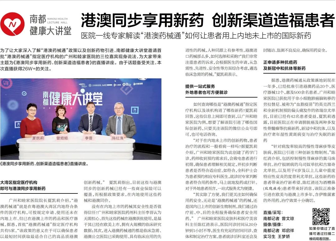 广州和睦家医院成为首批港澳药械通内地指定医疗机构之一,可以引进最新港澳进口药械,将为过去无法获得进一步治疗的部分患者带来新的治疗希望。目前已经引入包括肺癌用药劳拉替尼、降低胆固醇药英克西兰、创新偏头痛药安莫疼等等。同时也引入很多创新生物制剂疗法。(夏凯莉院长出席)