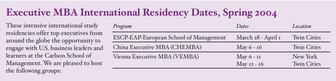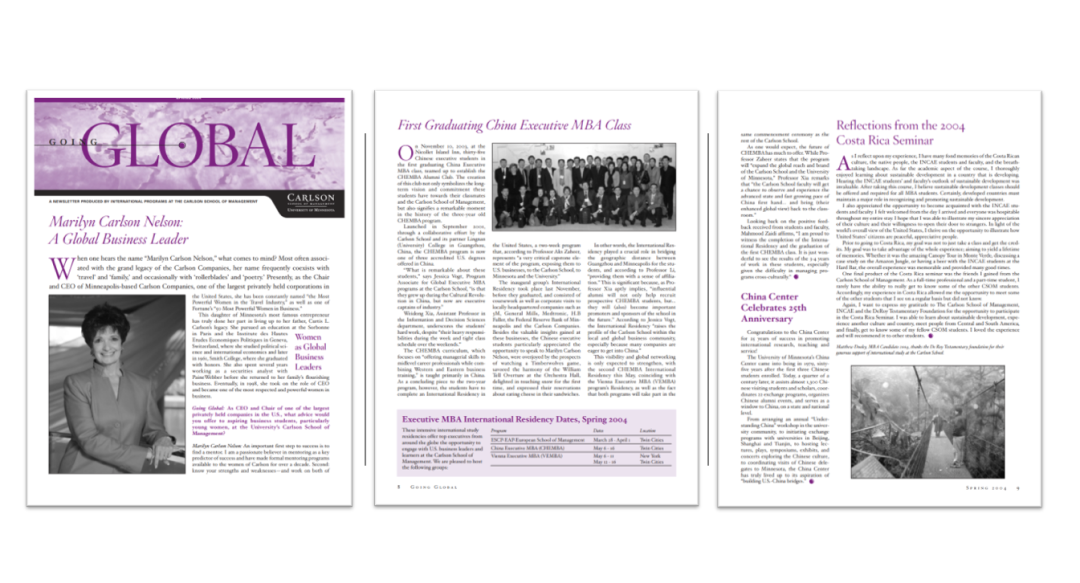 “First Graduating China Executive MBA Class”该文发表于卡尔森管理学院杂志“Going Global”2004年春版,特邀项目负责人、以及项目任课教授对该项目寄语,并对首批毕业学员表达祝福。