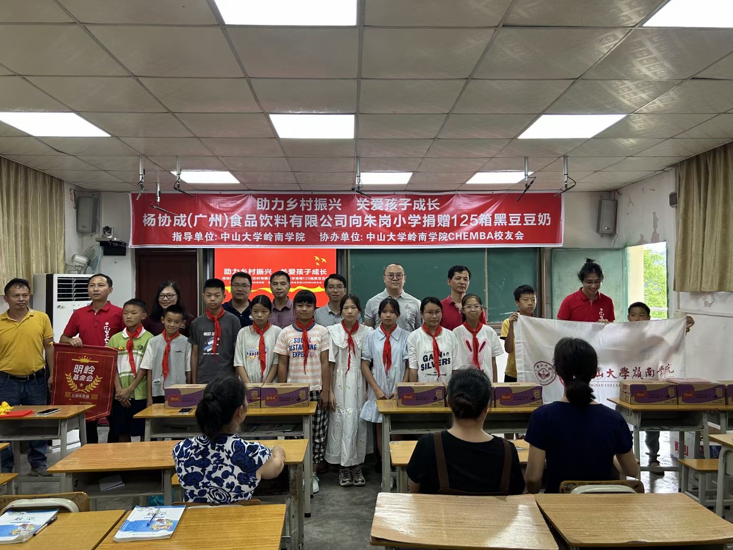 6月8日,CHEMBA校友张毅弘代表的杨协成(广州)食品饮料有限公司捐赠赞助125箱黑豆豆奶送达结对帮扶地连州市(广东省清远市代管的县级市)朱岗小学的孩子们。