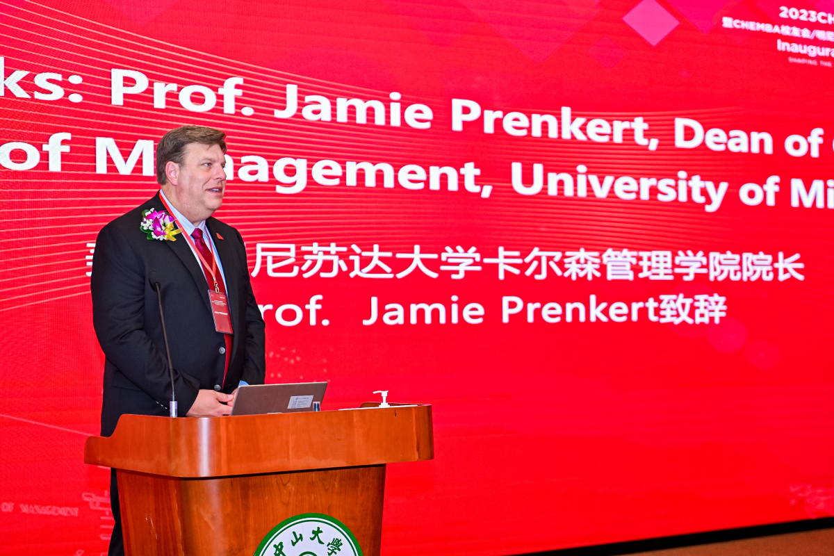 The Carlson School is proud of our enduring partnership of more than twenty years with Lingnan College of Sun Yat-sen University. The CHEMBA program was launched in 2001 as one of the first programs of its kind in China. Since then, over 600 talented, globally-minded business leaders have graduated from the program. As we come together, I want to recognize the significance of this intersection between the experienced wisdom and accomplishments of our CHEMBA alumni and the boundless potential of our newest CHEMBA students. The CHEMBA program is designed to propel business professionals to take their careers to new heights and drive change in their respective industries. This inauguration marks not only the beginning of an educational program for you, but also the forging of partnerships and cross-cultural ties that will shape your future as global business leaders.