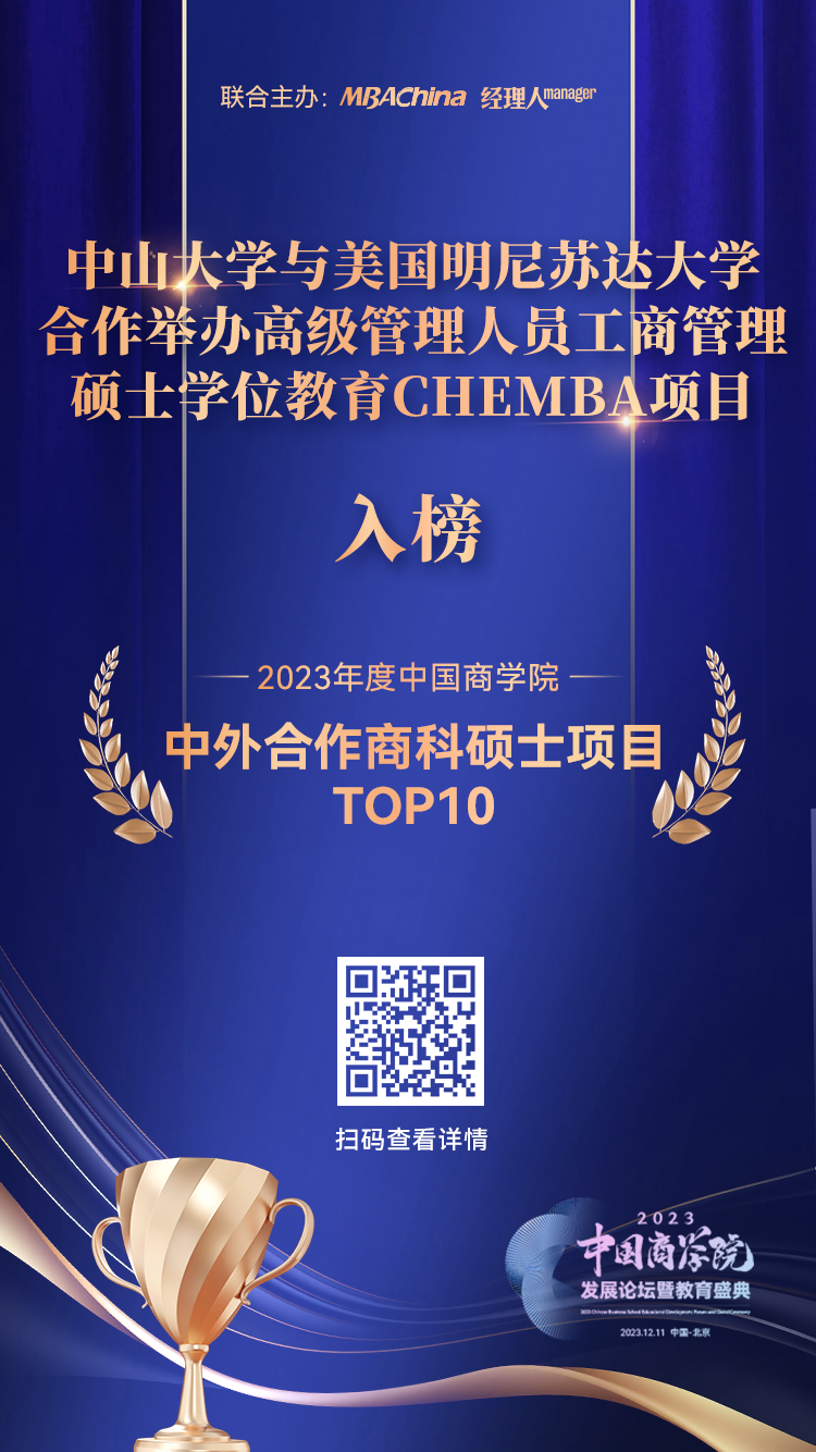祝贺yl9193永利集团与美国明尼苏达大学合作举办高级管理人员工商管理硕士学位教育CHEMBA项目荣获“2023年度中国商学院中外合作商科硕士项目TOP10”