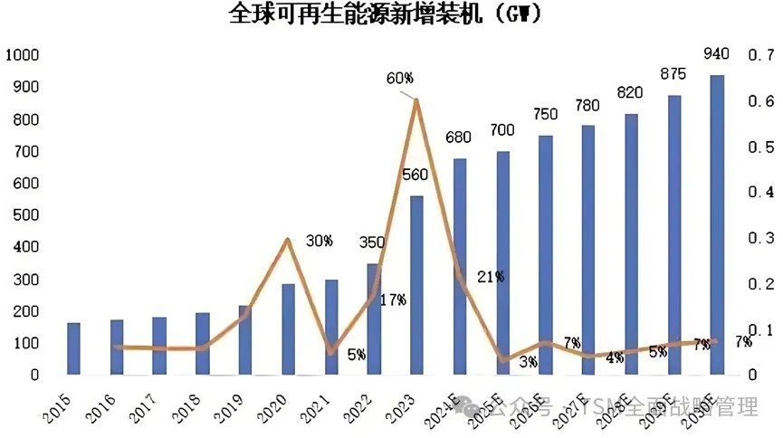 新能源化一方面体现在发电端的能源结构变化,即全社会的能源结构,将继续从不可再生能源向清洁和可再生能源的转变。根据IEA统计和预测,现阶段,每年流向可再生能源项目的投资接近 2 万亿美元,几乎是对新增石油、天然气和煤炭供给总投资的两倍,至2030年可再生能源新增装机量达到940GW(见图-4)。另一方面体现在新能源在用能端的渗透率提升。通过提升新能源在生产、存储、运输、消费等环节的效率并降低其相关成本,把单位的用能成本降至最低,从而让新能源加速替代传统能源,例如把煤电替代为太阳能发电、风电,把化石燃料替代为绿电、氢能、生物合成燃料等。其中新能源汽车就是一个典型例子,渗透率从2020年的5.8%逐年快速增长至2024年的47%。