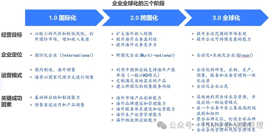 企业的全球化大致可以分为三个阶段:(图-6)。国际化阶段:企业主要通过海外代理商以出口贸易的方式进行海外市场拓展,这样可以较小的代价和较低风险,打开国际市场,增加收入来源;跨国化阶段:企业开始在海外建立销售服务网络,开始针对不同的区域市场提供差异化的产品,部分企业开始在海外建设工厂,以散件进口本地组装的方式进行生产,以规避高额关税,降低生产成本;全球化阶段:企业在利用全球生态资源,建立一套集研发,采购,生产,销售,服务和业务管理于一体的全球化运营体系,企业也成为全球化+本地化(Glocal)的企业。回顾经济发展史,全球已经经历了四次全球化浪潮,第一次全球化浪潮始于19世纪末,结束于1914年,受益于工业革命带来的交通和通信进步。第二次全球化浪潮是从1945年二战结束到1989年的这段时期。第三次浪潮从1989年柏林墙倒塌和1991年苏联解体开始,以2008年全球金融危机告终。随着全球从金融危机中复苏,数字经济崛起、人工智能发展以及中国作为全球经济动力发挥日益重要的作用,第四次浪潮于2010年拉开序幕。但从2018年开始,随着国际地缘政治格局的剧烈变化,特别是后疫情时代,我们看到保护主义情绪、关税和其他贸易壁垒的增加,呈现出逆全球化,甚至去全球化的迹象。但不管怎样,作为世界工厂和全球工业制造龙头的中国,无论从产能的释放还是从业务盈利性角度(一般企业海外业务的毛利都远高于国内业务),全球化肯定是大多数企业的必然选择,无论是从小规模的出口贸易商或者跨境电商的卖家,还是到规模化、全球化运营的企业,都可以走自己的全球化之路,也就是说未来大部分的中国企业都将会是国际化企业。