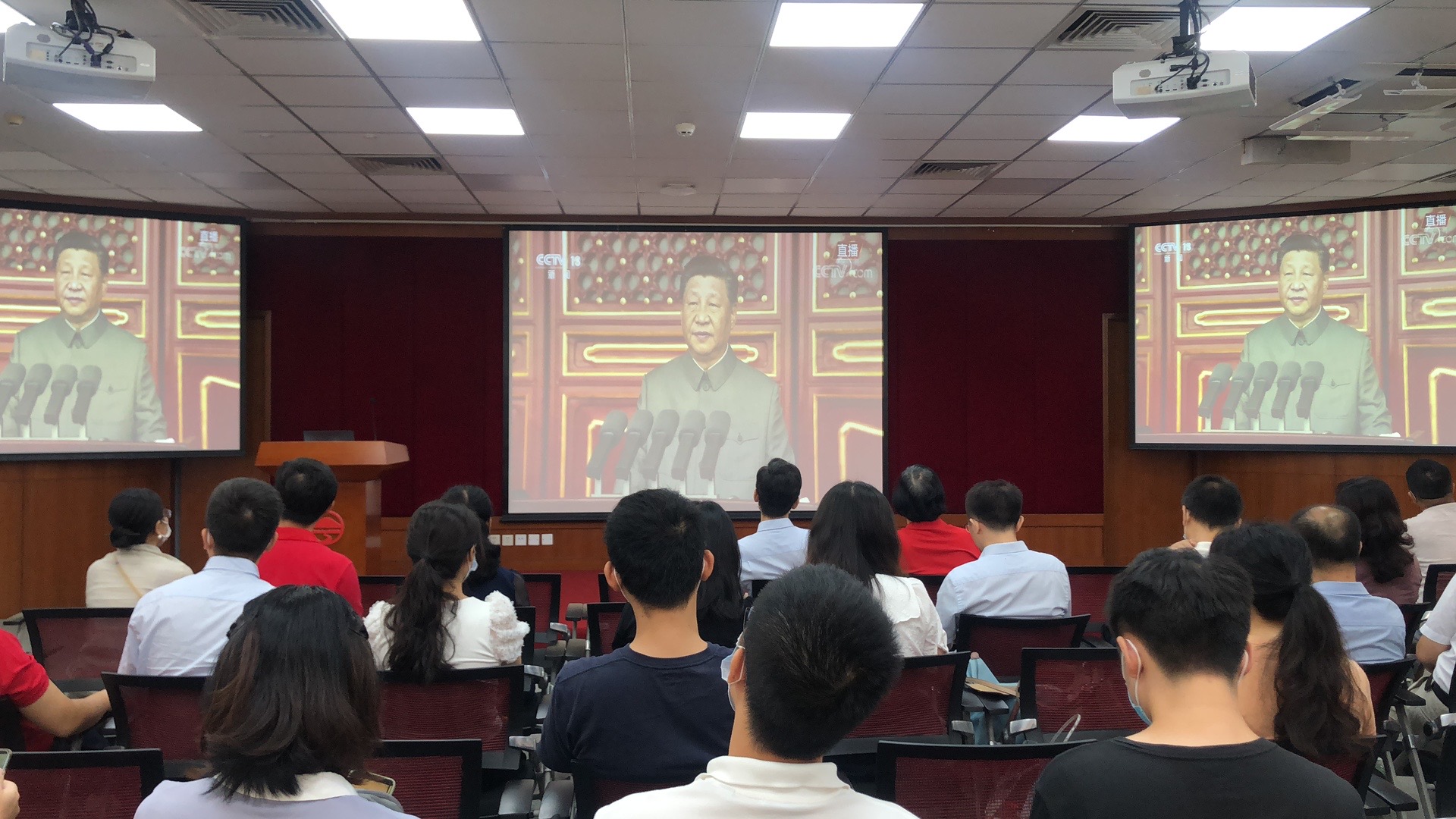 7月1日上午8时,庆祝中国共产党成立100周年大会在北京天安门广场隆重举行。中共中央总书记、国家主席、中央军委主席习近平发表重要讲话。我院党员师生在学院党委陈险峰书记、黄涛副书记带领下在岭南堂三楼陈荣捷讲学厅集中收看大会直播。