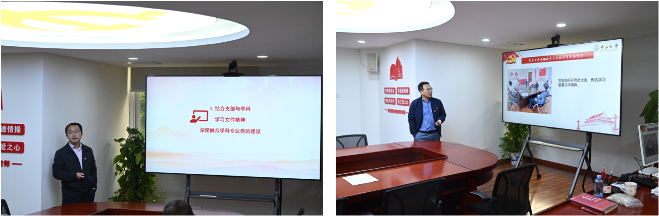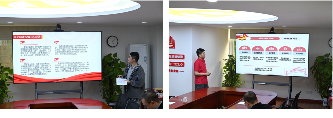 教职工党支部书记紧紧围绕“党建与学科相结合、党务与业务相统一”理念分别进行详细汇报。在学院党委领导下,教职工党支部已形成教研室、研究中心和党支部“三位一体”模式,服务国家重大战略需求,切实推进党建引领“有组织的科研”,扎实推进学院各项事业发展。同时,各支部结合学院学科特点和人才培养目标,针对性开展思想政治教育,丰富党日活动、组织生活形式,将师德师风建设、课程思政建设落实落细。