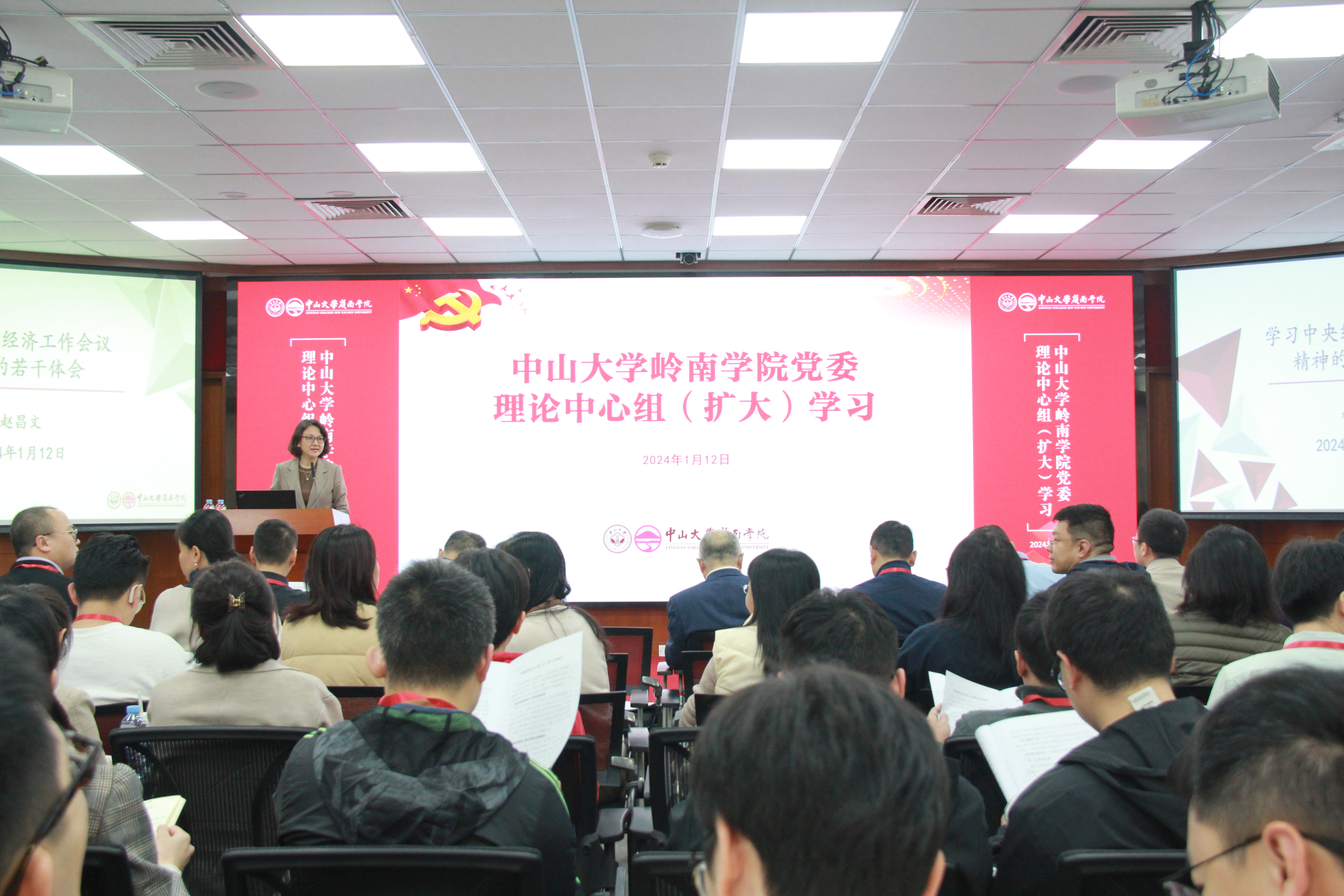 2024年1月12日下午,岭南学院在岭南堂三楼陈荣捷讲学厅召开岭南学院第四届教职工代表大会暨工会会员代表大会第四次会议。岭南学院院长李善民,副院长鲁晓东、刘彦初、林建浩、党委副书记樊峰会,院长助理柳建华,学院分工会主席何兴强以及29位“双代会”正式代表、81位列席代表共同参加了本次会议。会议由学院党委副书记樊峰会主持。