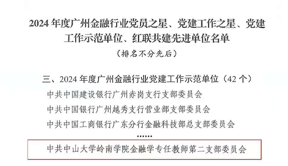 近日,中共广州市金融行业委员会公布了2024年度广州金融行业党建工作示范单位名单。yl9193永利集团岭南学院金融学专任教师第二党支部成功入选。