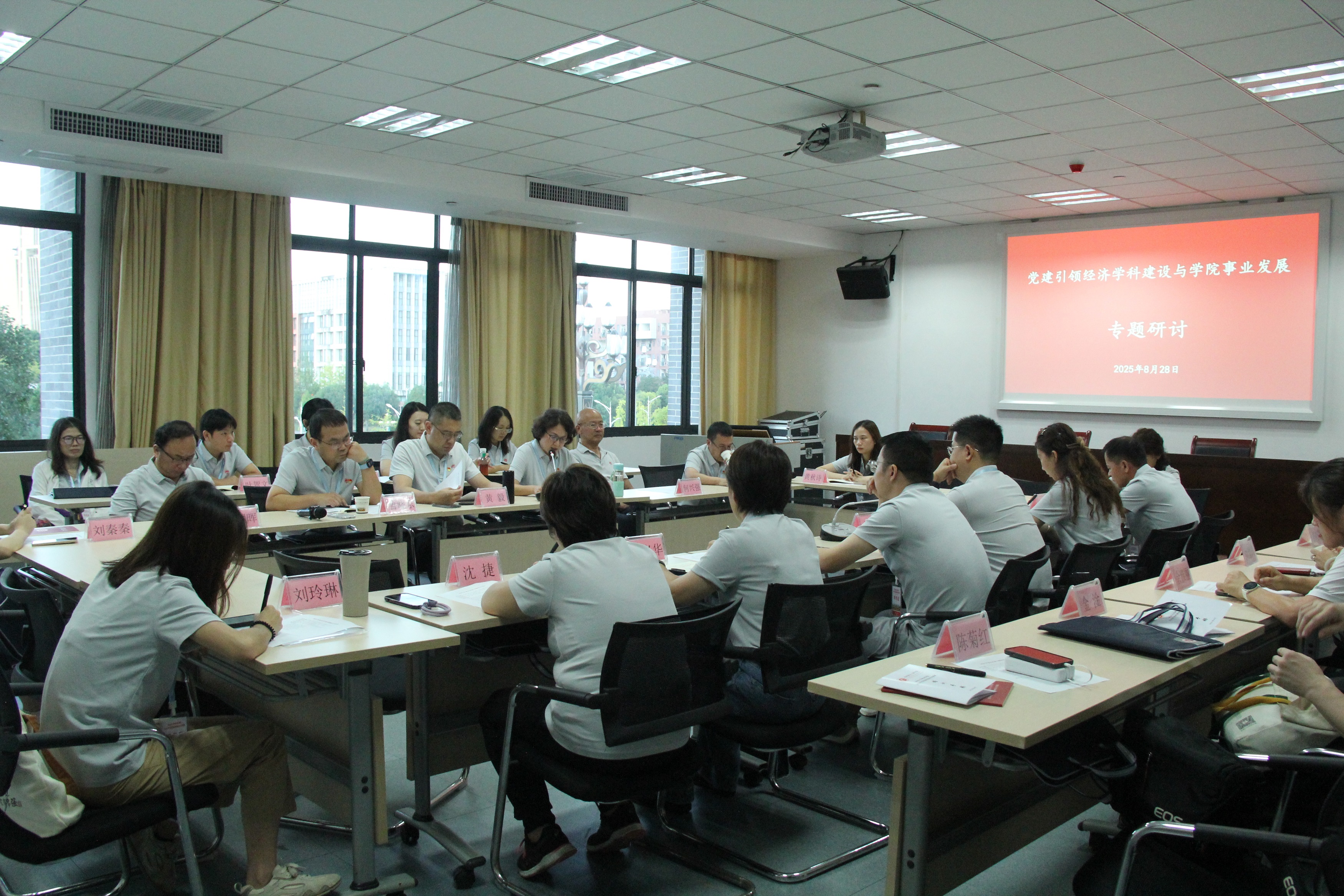 在专题研讨环节,学员围绕“党建引领经济学科建设与学院事业发展”进行深入研讨。其中,樊峰会副书记、鲁晓东副院长,金融学专任教师第一党支部书记罗党论教授、金融学专任教师第二党支部副书记龙朝晖副教授、行政教辅教工党支部书记严寒作重点发言。