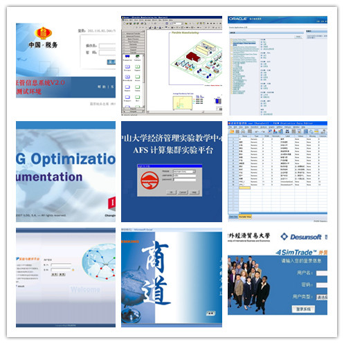 实验中心的教学软件除了购置之处,很重要的一部分是与企业合作共同开发的。例如,Oracle E-Business Suite 12.1.2、BusinessObjects XI、用友ERP、SAP ERP/Business One、SAP Business ByDesign、金蝶ERP/K3、国税系统软件等,以及中心老师自主开发的以AFS分布式文件系统为核心的计算集群实验平台、RFID实验功能平台、实验室管理系统、SAAS开发平台等。