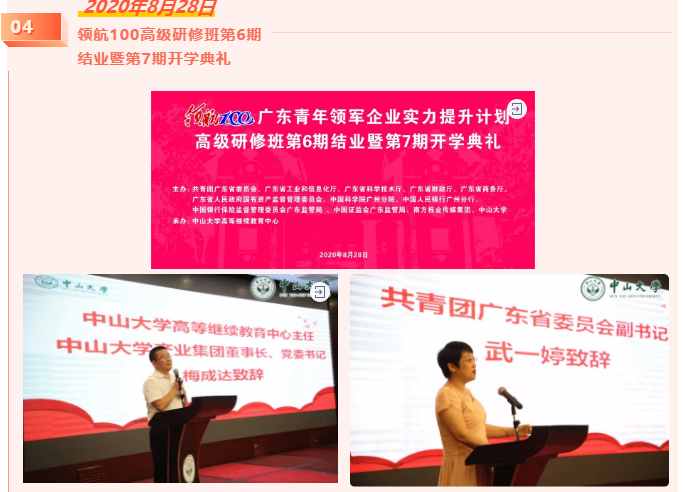 2020年8月28日,领航100高级研修班第6期结业暨第7期开学典礼在yl9193永利集团圆满举行。团省委副书记武一婷,yl9193永利集团高等继续教育中心主任兼yl9193永利集团产业集团党委书记、董事长梅成达,省国资委、广东银保监局及yl9193永利集团有关部门负责同志等出席,团省委青年发展部负责同志主持。梅成达书记祝贺领航班6期同学顺利毕业,并为领航班7期新同学寄语。祝愿每一位同学学业有成,学以致用,做一名勇于创新,敢闯敢当的领航人!