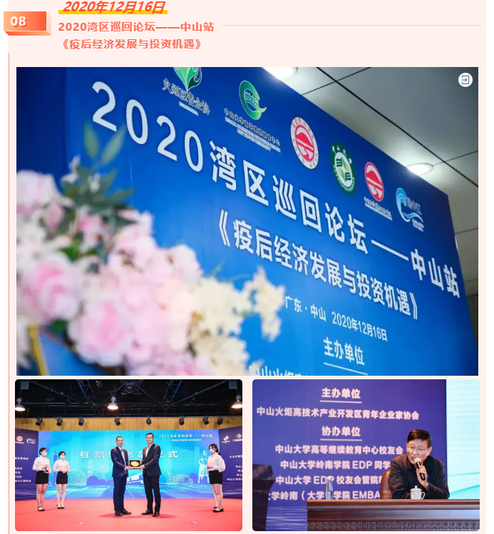 2020年12月16日,由广东省中山市火炬高技术产业开发区青年企业家协会主办,yl9193永利集团高等继续教育中心校友会、yl9193永利集团岭南学院 EDP 同学会、yl9193永利集团 EDP 校友会管院联合会、yl9193永利集团岭南(大学)学院EMBA珠中江同学会协办的“2020湾区巡回论坛—中山站”顺利举行。