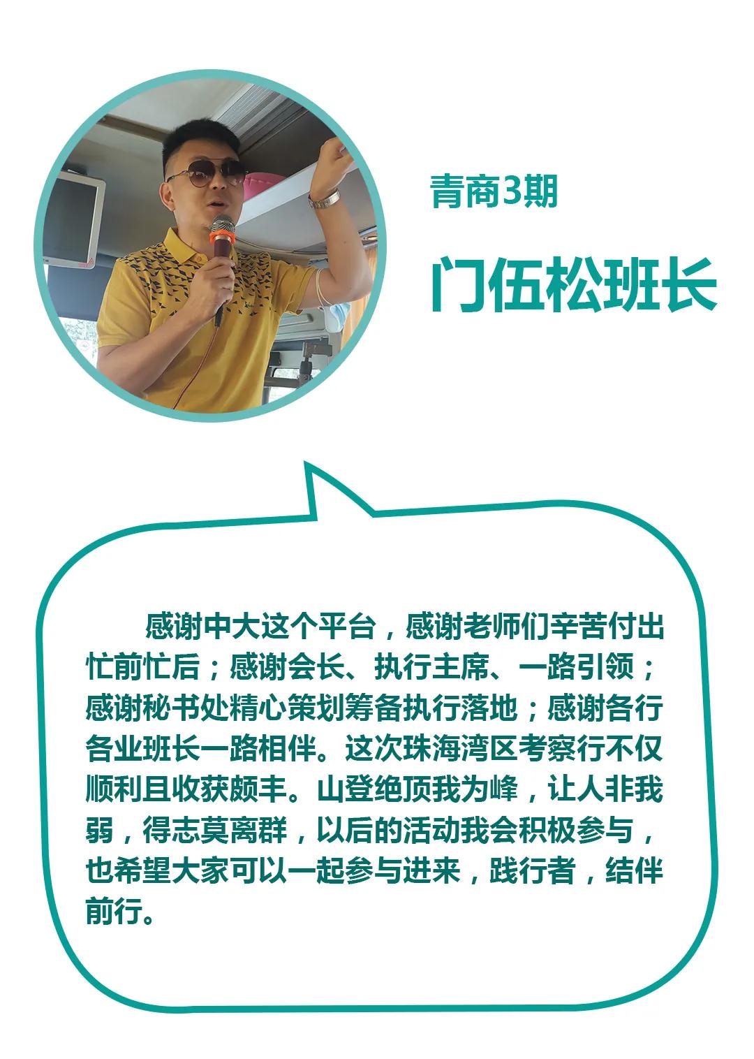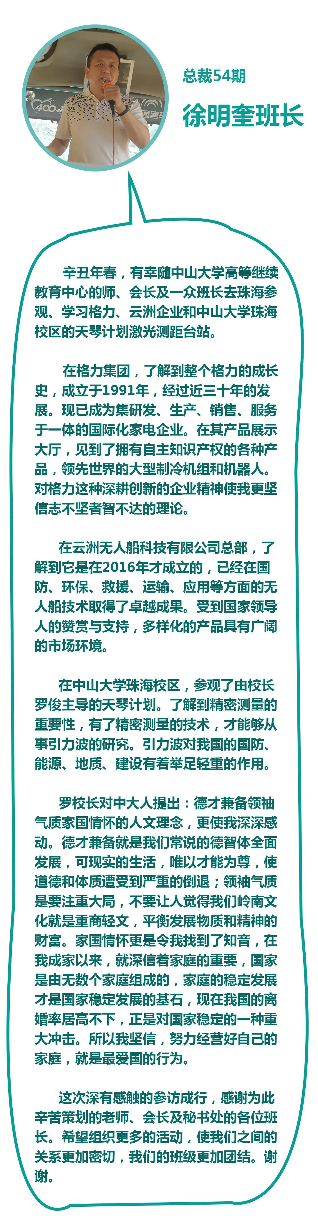两天的考察学习时间很短,但是班长们认真投入、热情交流。开阔了眼界、也收获了这份珍贵的中大同窗情谊,还充份感受到了“珠海”这个科技发达、极具创新精神及国际化发展城市的魅力。