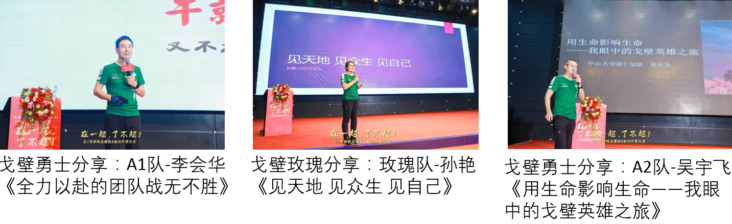 分享环节,五位征7队的戈壁勇士及玫瑰代表在大会上进行戈壁征赛的感悟分享。队员们表示此次戈壁行就像是一场历练,也是一场团队、院校的荣誉之战,自我身心都在蜕变的路上。四天四夜122公里,穿越莫贺延碛戈壁,途中经历了对个人意志力的考验,也收获了自我的突破和珍贵情谊。茫茫戈壁,皆是姐妹兄弟。相信星火不灭,前路可期。在一起,了不起。