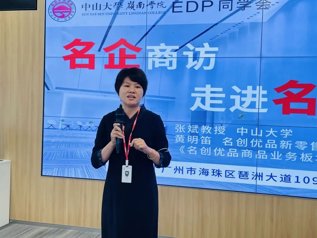 本次商访更邀请到名创优品集团新零售商品部商品总监黄明笛为师生一行作《名创优品商品业务板块》的主题分享,分享要点包括:1、三高三低的创新优质低价商业模式快速开店领跑杂货百货市场;2、IP化-品牌IP战略运营,产品火爆市场;3、线上线下如何连接全渠道引流私域。互动交流环节,校友们积极探讨并踊跃提问,黄总监结合企业发展战略与校友们相互学习、交流经验,活动最后特邀张斌教授进行总结发言。