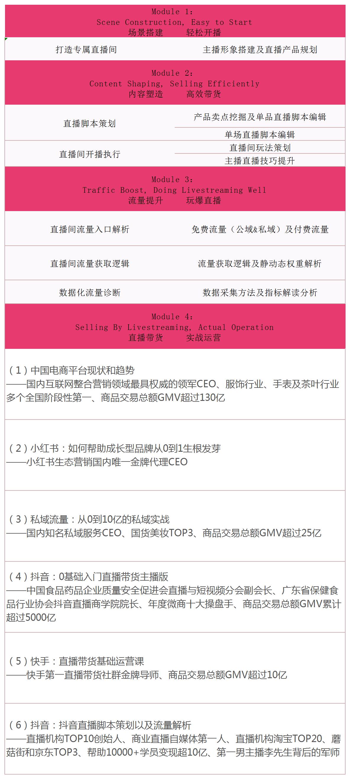 随着区域全面经济伙伴关系协定签署和新冠疫情等事件对全球经济带来的影响,全球面临众多新的机遇和挑战,通过新技术新业务来实现互联互通,共建高质量合作是海内外一致的诉求。本次研习营重点围绕“场景搭建 轻松开播”、“内容塑造 高效带货”、“流量提升 玩爆直播”、“直播带货 实战运营”四大主题,通过课程内容分享、互动交流、案例分析与研讨结合的形式,帮助学员了解新媒体营销-直播电商的发展机遇和最新的趋势,探寻数字经济时代新的商业机会点!