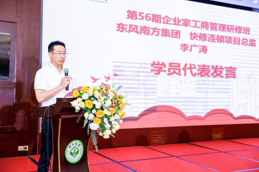 第56期企业家班工商管理研修班李广涛作为学员代表分享到,他表示用两个词概括他此时的心情——自豪和感恩,在百年中大结业礼成是人生值得自豪的事情,感恩老师们的倾囊相授,感恩学习过程中给予我们的宽容、支持、鼓励。最后感恩提供参访交流平台的同学,让大家探访中突破行业壁垒、增进了解、发掘合作机会、携手共赢。