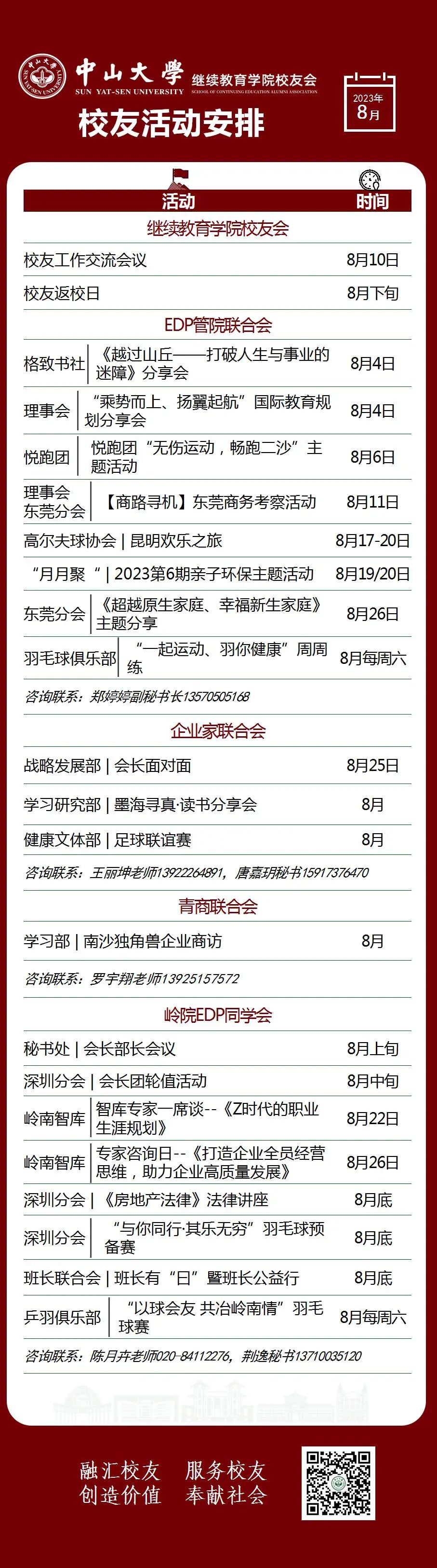 校友活动月报: 传递最新校友活动播报。“炎炎盛夏,暑热正酣”,2023年7月,校友会各分组织举办了多场精彩纷呈的活动。链接校友,创新价值,打造高质量校友交流平台,欢迎校友们关注支持,一起向未来!