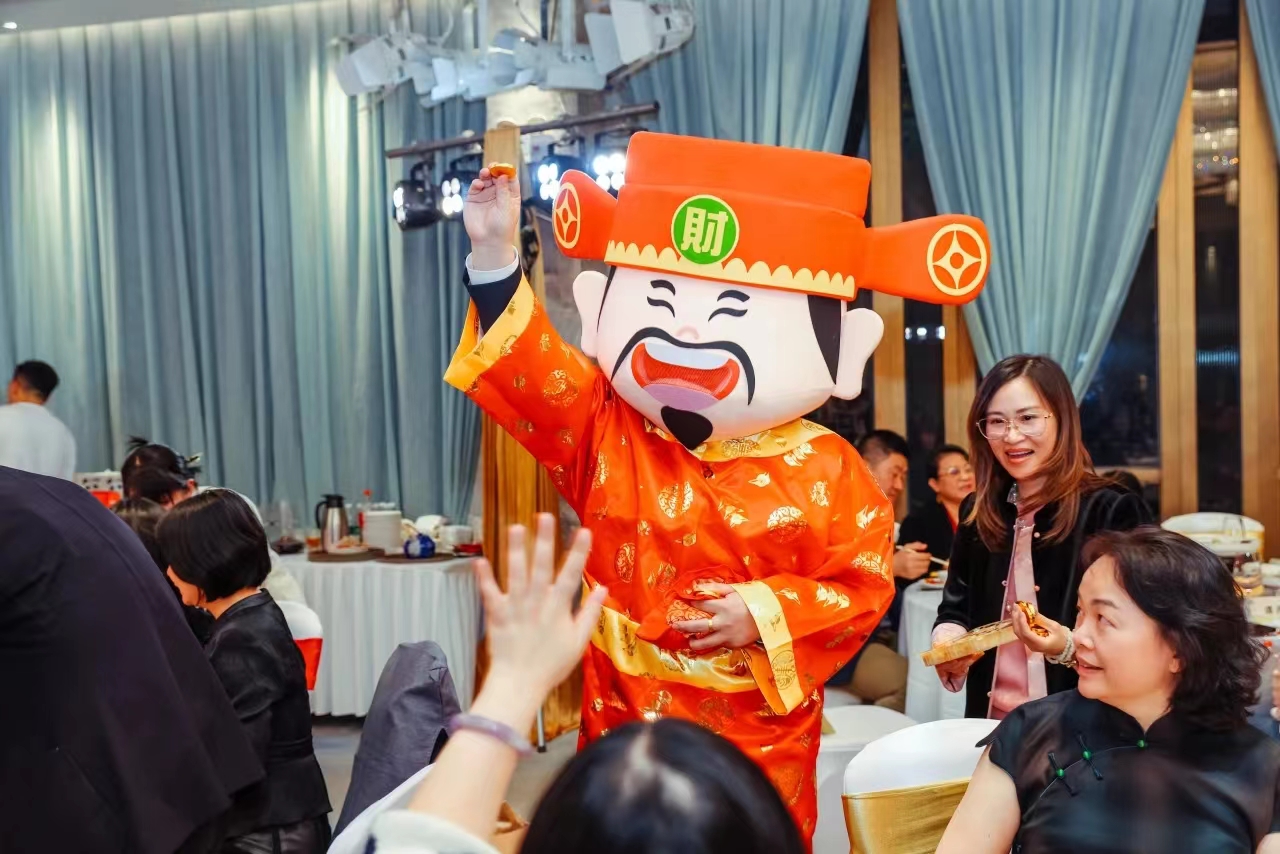 在交流晚宴中,来自61期企业家班的唐世文同学,作为企业家联合会的副会长,秉承会长服务理事的理念,亲自穿上财神玩偶服,为各位校友、理事派送金币巧克力,新的一年派福送财,祝愿各位校友事业蒸蒸日上!