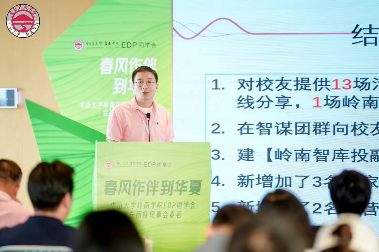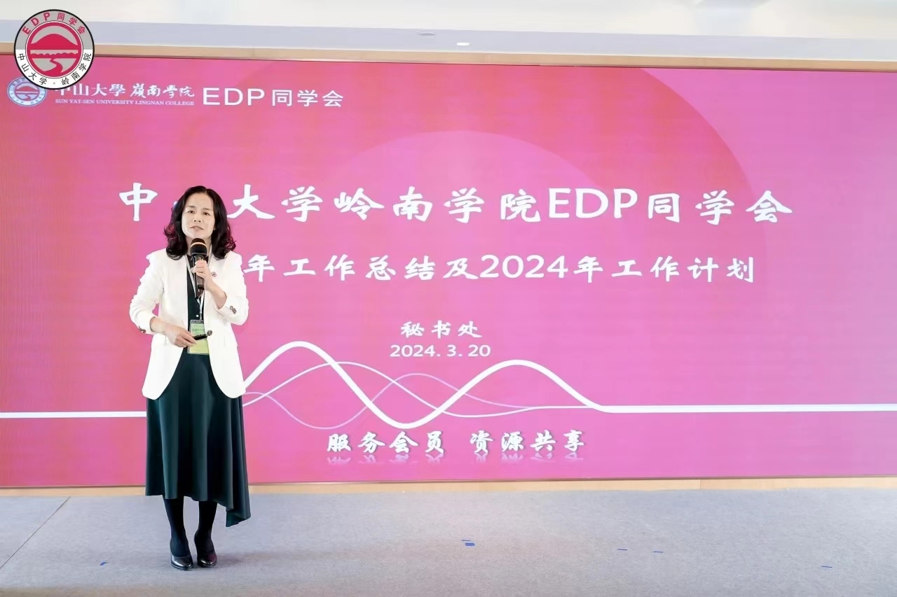 汇报最后,岭院EDP同学会副会长兼联席秘书长刘新玲代表秘书处作同学会2023年总工作汇报,展示了2023年同学会亮点工作,并简单回顾了过去一年各部门、行会、分会活动开展亮点,同时阐述了围绕中大百年校庆、同学会15周年而开展2024年重点工作规划。