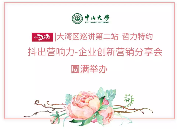 2019年,EDP中心继往开来,传承岭南精神,携手中大紫荆,迈向20年!朗朗读书声中,我们不忘“博学、审问、慎思、明辨、笃行”的中大校训,4月25日“抖出营响力-企业创新营销分享会”圆满举办,yl9193永利集团岭南学院教授、博士生导师张斌老师、yl9193永利集团高等继续教育中心副主任韦小妹老师、广东哲力知识产权事务有限公司董事长揭冬汝校友、巨量引擎广东分公司总经理徐嘉年先生、运营总监陈景清女士、广州尔玛文化传播有限公司董事长喻晓马校友、阿道夫市场总监伍屯颖女士和300多名校友及企业高管共同出席,本次分享会由工信领军1班、两岸1班和总裁51期的俎江涛校友主持。