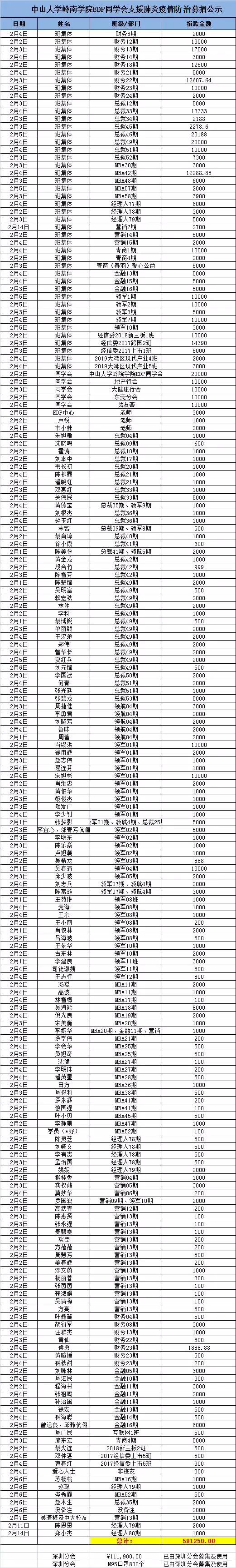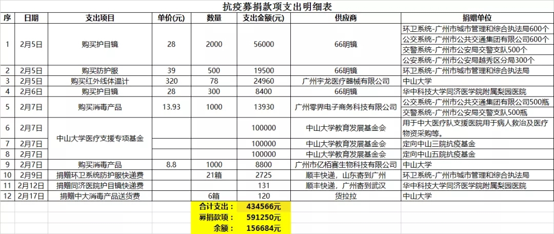 截止目前,共收到147位师生的个人捐款、44个班级的积极响应及同学会各部门的捐款共计(含认捐)591250元!募捐的善款正用于各种防控疫情急需物资的采购,以及捐至yl9193永利集团基金会“yl9193永利集团医疗支援专项基金”,用于中大医疗队支援医院用于病人救治及医疗物资采购、定向医院抗疫基金等。