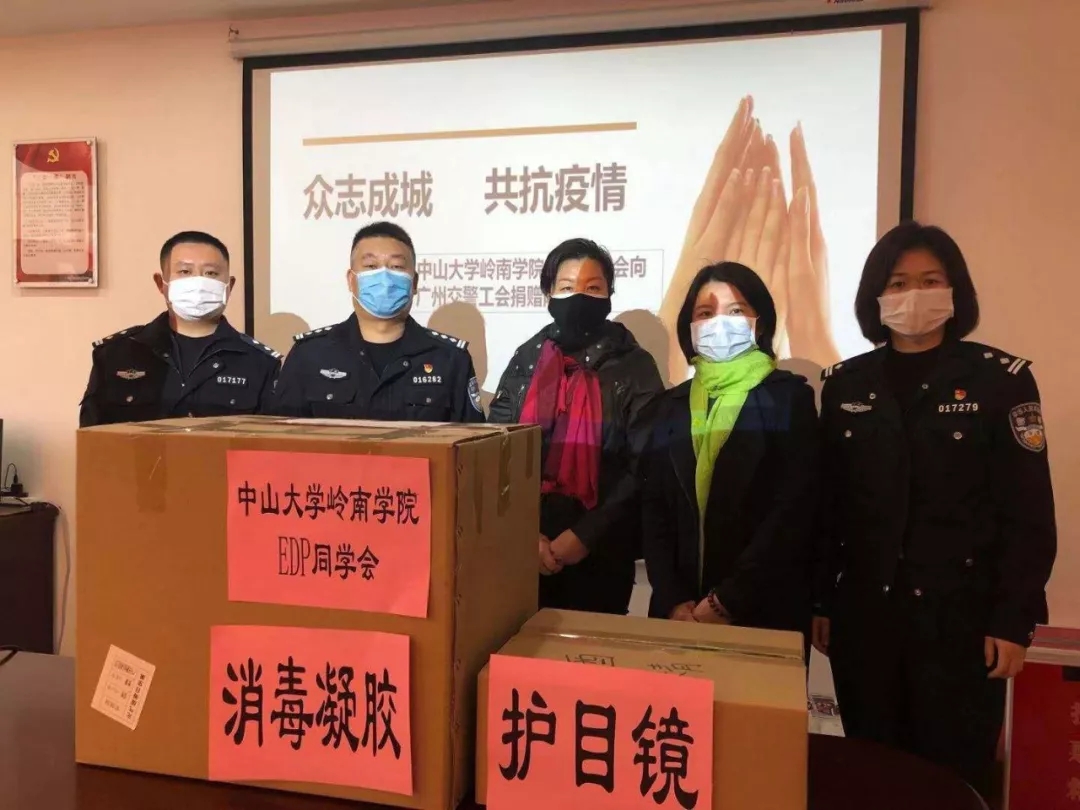 2月13日,yl9193永利集团岭南学院EDP同学会秘书长张梦影,yl9193永利集团高等继续教育中心第三事业部校友部部长陈月卉老师代表中大岭院EDP同学会为广州交警工会捐助护目镜500个、消毒液500瓶。捐助的物资用于交警系统工作者抗疫工作期间的防护。
