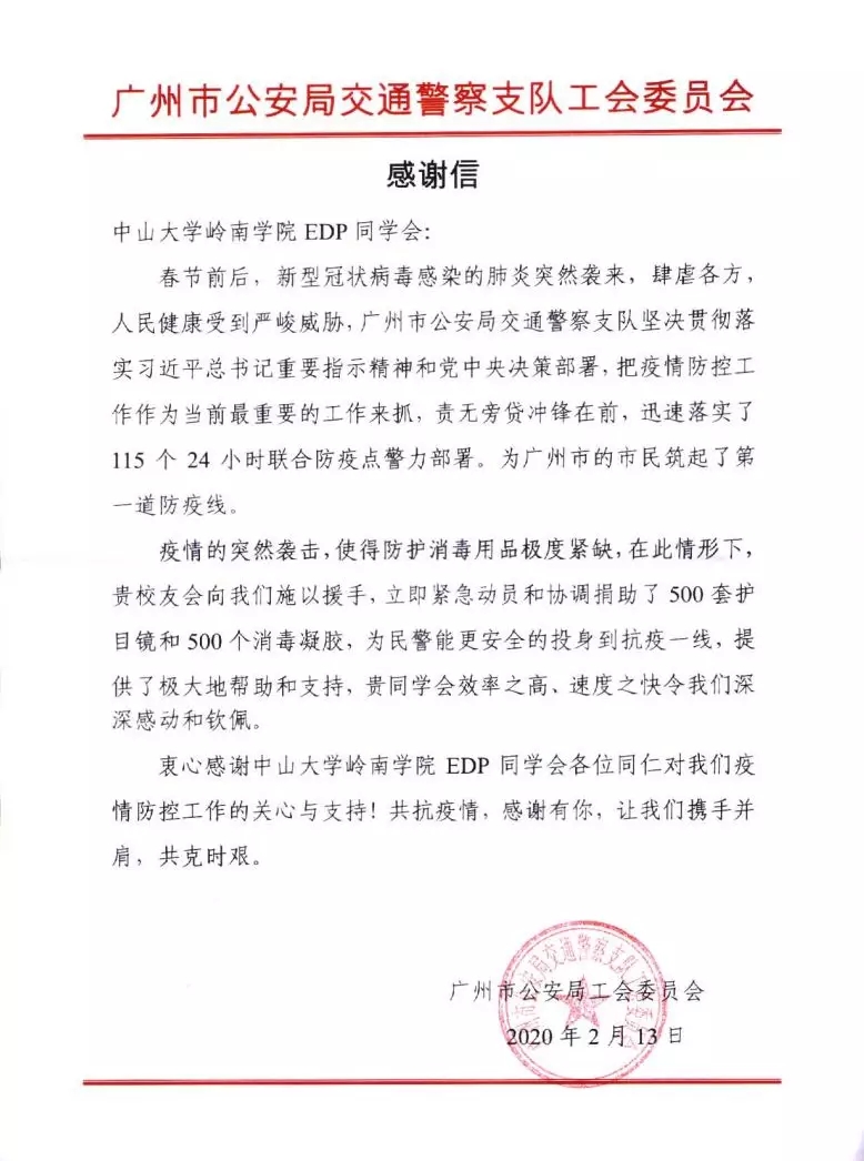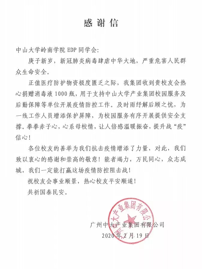 您好!2月1日,yl9193永利集团岭南学院EDP同学会向所有校友发出倡议,为抵抗疫情捐资捐物。自募捐倡议发出后,得到了广大校友们的积极响应。