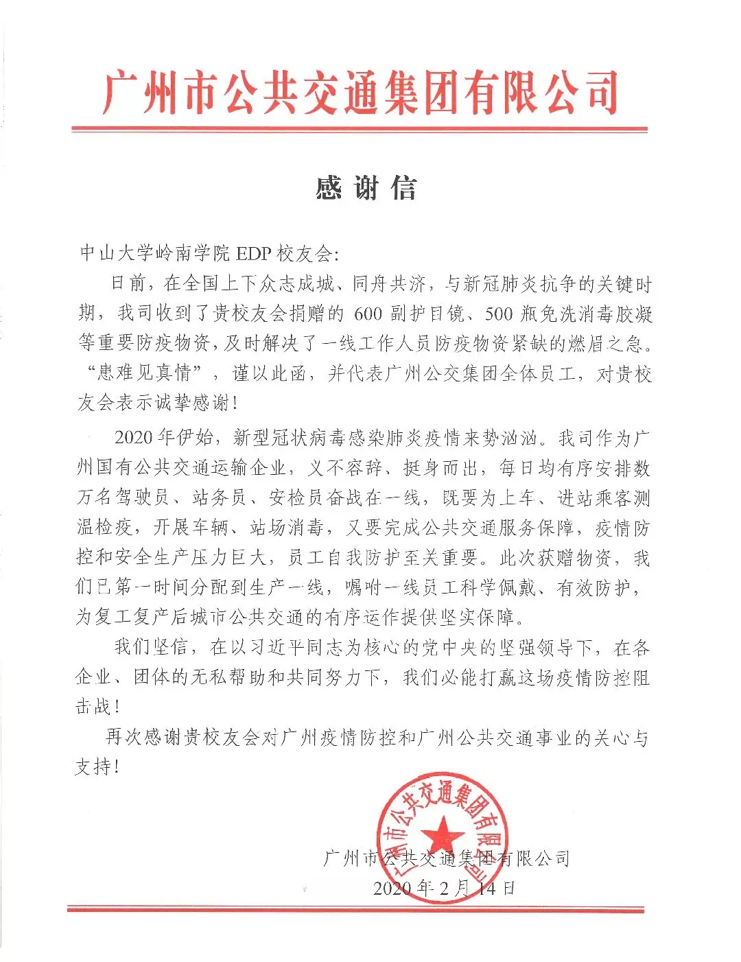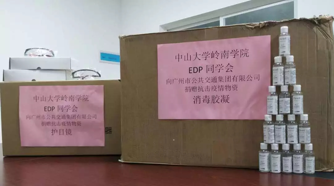 2月初,yl9193永利集团岭南学院EDP同学会为广州市公共交通集团有限公司捐助护目镜600个,消毒水500瓶。捐助的物资用于公交系统工作者抗疫工作期间的防护。