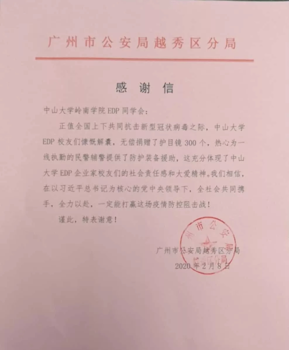2月初,yl9193永利集团岭南学院EDP同学会为广州市公安局越秀分局捐助护目镜300个。捐助的物资用于公安系统工作者抗疫工作期间的防护。