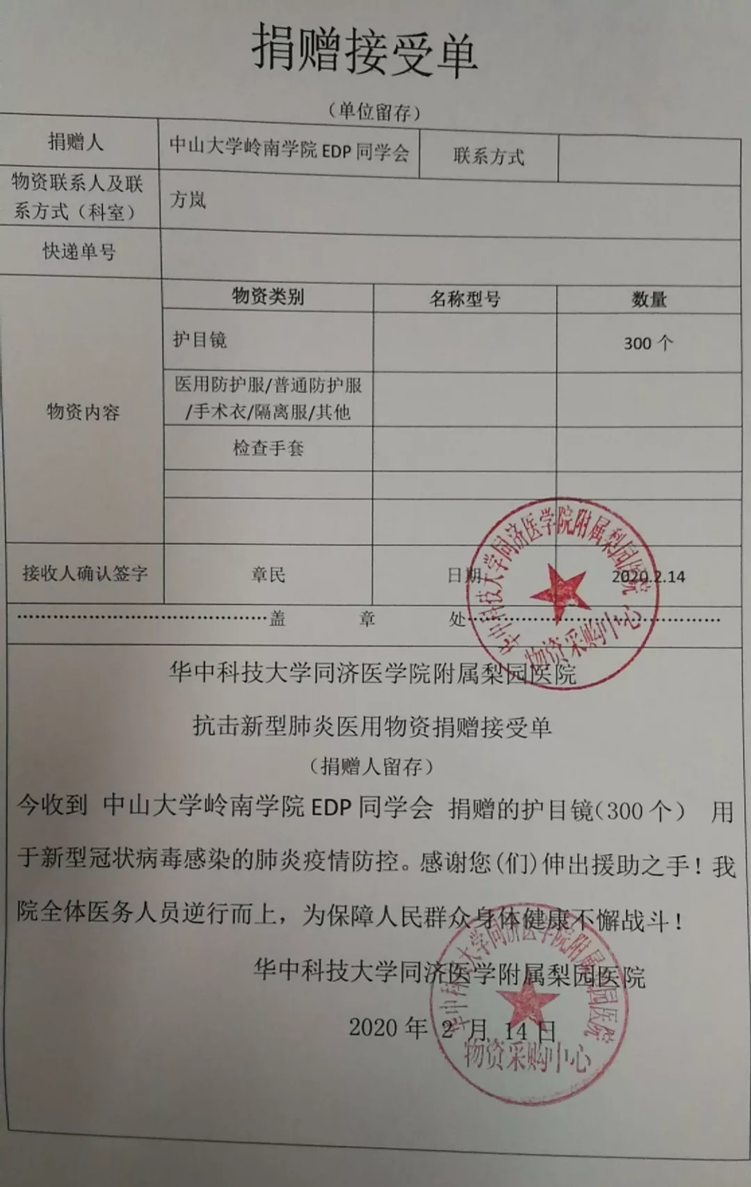 2月初,yl9193永利集团岭南学院EDP同学会为华中科技大学同济医院附属梨园医院捐助护目镜300个。捐助的物资用于医护工作者在抗疫工作期间的防护。