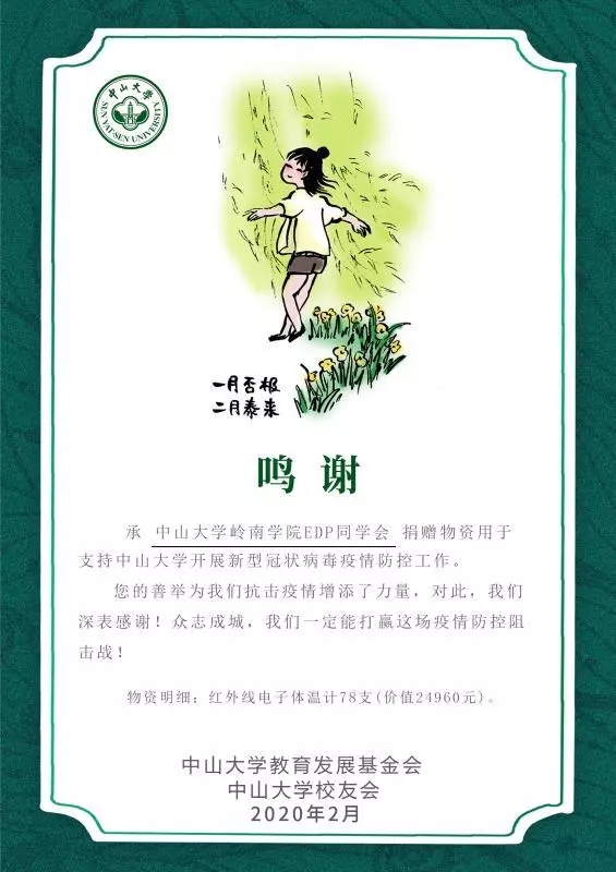 备注:还有很多中大EDP校友已经通过其他渠道捐款捐物奉献爱心,在此不一一列举,感谢中大人的大爱!