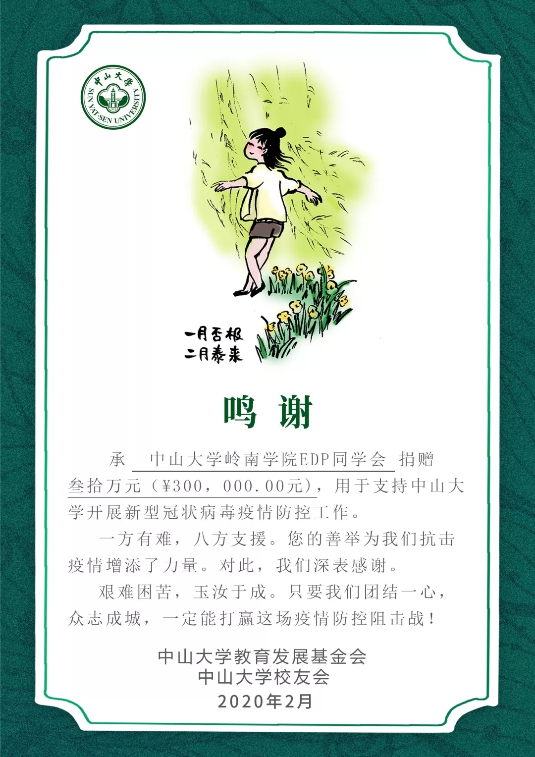 2月10日,yl9193永利集团校友会官微公示如上。yl9193永利集团教育发展基金会已确认收款由yl9193永利集团岭南学院EDP同学捐出的30万元。