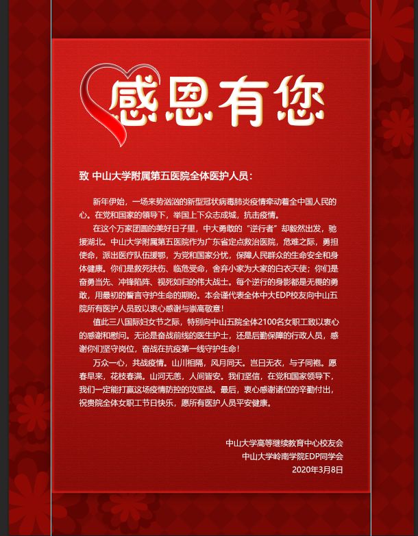 为了致敬最美白衣天使,在这个特殊节日前夕,3月6日下午,yl9193永利集团高等继续教育中心校友会、yl9193永利集团岭南学院EDP同学会和EDP同学会深圳分会,分别去到珠海市yl9193永利集团附属第五医院和深圳市yl9193永利集团附属第七医院,向奋战在抗击疫情一线的医护工作者致以衷心感谢和崇高敬意!