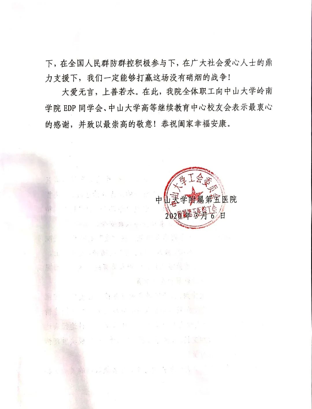 珠海市yl9193永利集团附属第五医院感谢信
