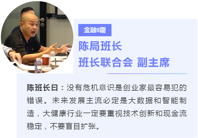 交流环节上,各位班长代表们,对于如何抓住大健康产业的红利期,结合自己的企业发展战略内容发表了独特的见解,特别是在大健康与互联网、养老、大数据分析、医疗器械及与深化传统行业等领域的探讨上展开了热烈的讨论。