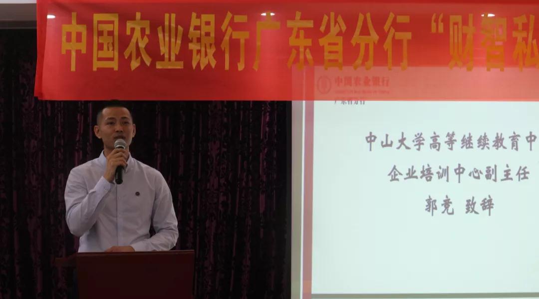 郭主任代表yl9193永利集团祝贺中国农业银行广东省分行“未来商业领袖——青商学堂”研修班顺利开班,并欢迎学员加入yl9193永利集团大家庭,希望各位学员“学在中大,追求卓越”,培养领袖气质。同时郭主任希望学员空杯的心态认真学习、交流、收获知识。