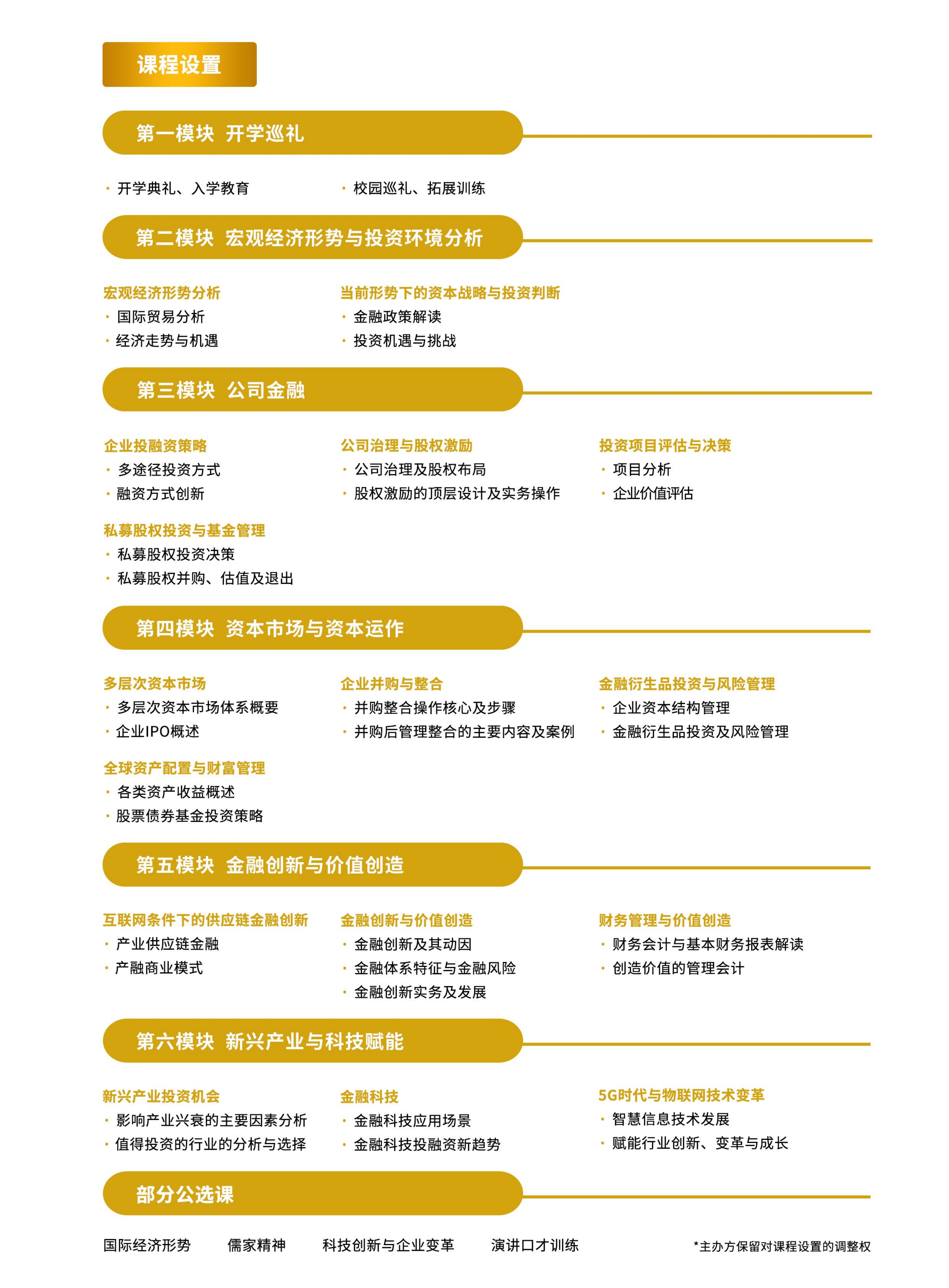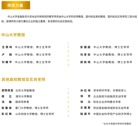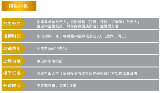金融投资 与资本运作研修班 不定期 咨询电话余主任 020-84113360 张老师 020-84112114 符老师 020-84112091 孙老师 020-84113884 黄老师 020-84112100 导航痕迹 yl9193永利集团岭南学院高层管理教育(EE)中心 公开课程 专业|金融投资与资本运作班 金融投资与资本运作班 综合 | 企业家工商管理高级研修班 综合 | 企业家工商管理高级研修班(深圳) 综合 | 经理人工商管理研修班 综合 | 青商学堂 综合 | 领军企业家科技与人文高级研修班 专业 | 金融投资与资本运作班 专业 | 财务总监高级研修班 专业 | 营销管理高级研修班 短训课程 学习卡 金融投资与资本运作班 课程特色课程设置招生对象报名事项师资力量学生情况增值服务学员风采