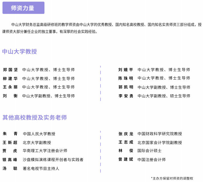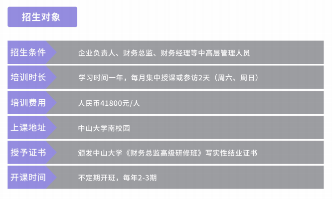 财务总监(CFO)高级研修班 不定期 咨询电话余主任 020-84113360 张老师 020-84112114 符老师 020-84112091 孙老师 020-84113884 黄老师 020-84112100 导航痕迹 yl9193永利集团岭南学院高层管理教育(EE)中心 公开课程 专业|财务总监高级研修班 财务总监高级研修班 综合 | 企业家工商管理高级研修班 综合 | 企业家工商管理高级研修班(深圳) 综合 | 经理人工商管理研修班 综合 | 青商学堂 综合 | 领军企业家科技与人文高级研修班 专业 | 金融投资与资本运作班 专业 | 财务总监高级研修班 专业 | 营销管理高级研修班 短训课程 学习卡 财务总监高级研修班 课程特色课程设置招生对象报名事项师资力量学生情况增值服务学员风采