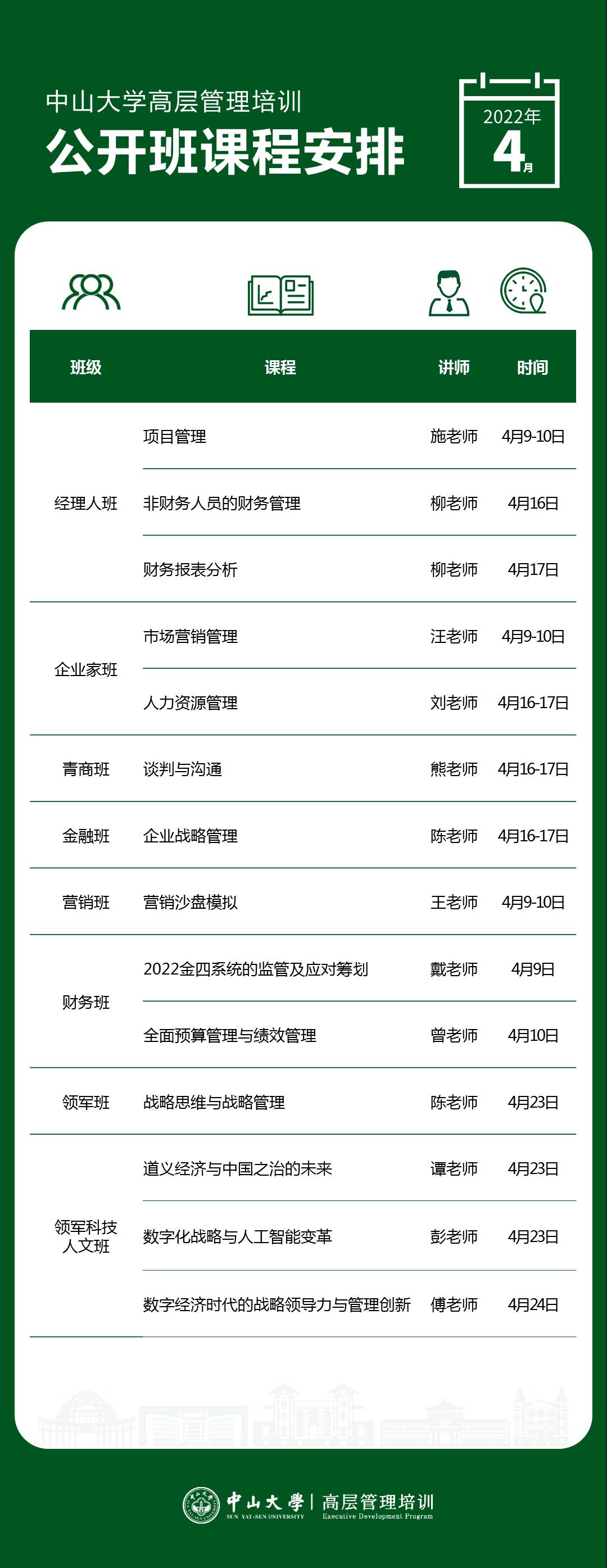 进学致和,行方思远。 以下是高层管理培训公开课4月课程表。新班即将开学,欢迎咨询报名加入新班!