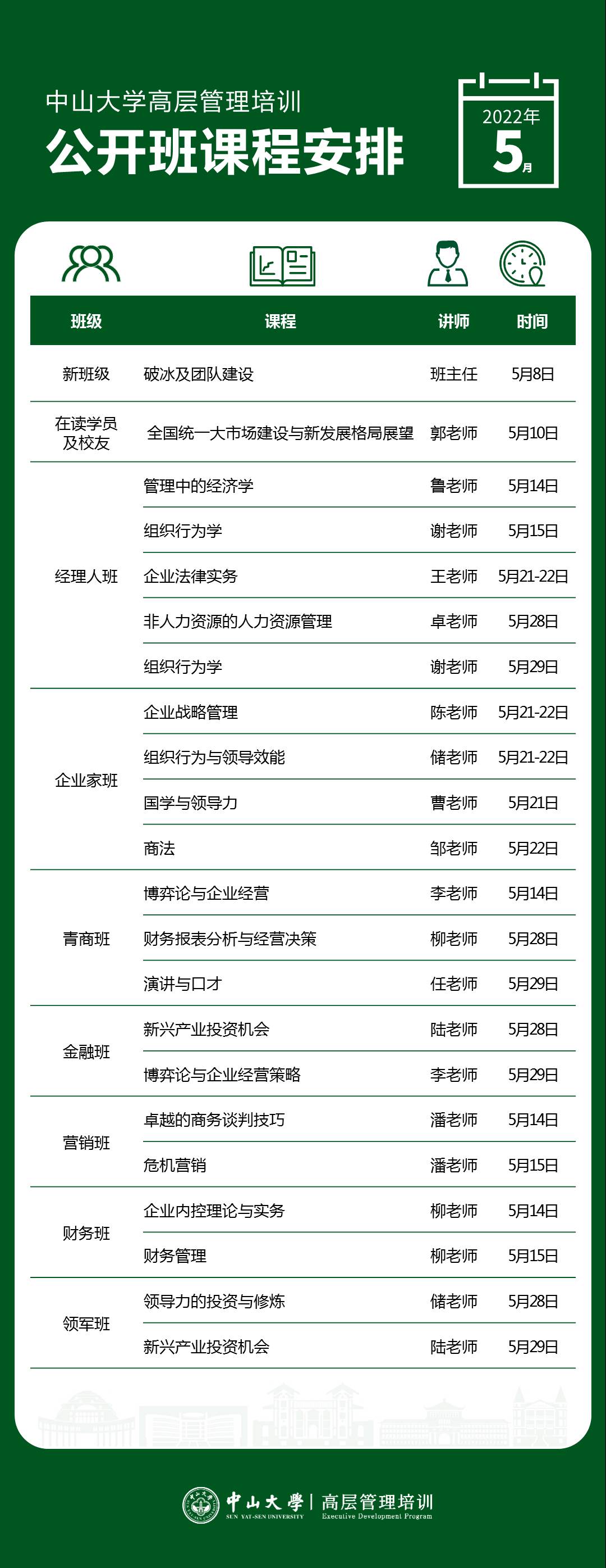 以下是高层管理培训公开课5月课程表,新班即将开学,欢迎咨询报名加入新班。