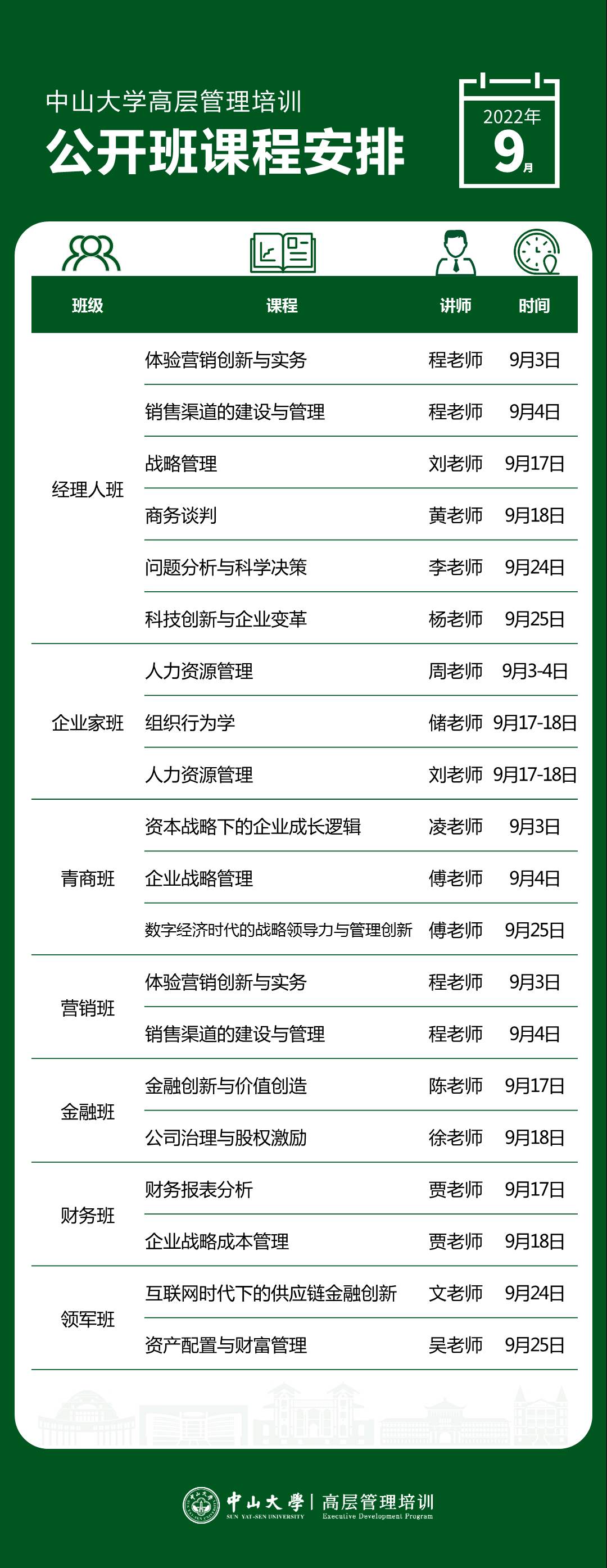 以下是高层管理培训公开课9月课程表,新班将在9月25日开班,欢迎咨询报名加入新班!