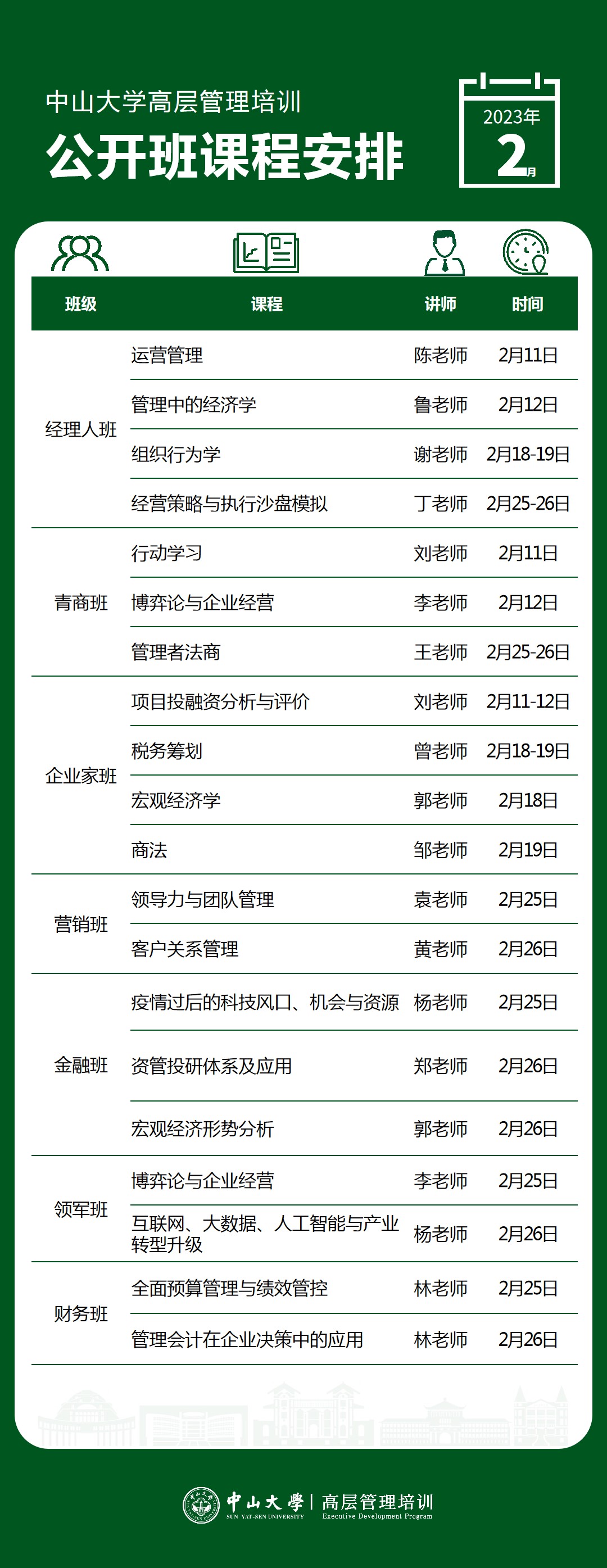 以下是高层管理培训公开课2月课程表,新班将在2月25日开班,欢迎咨询报名加入新班!