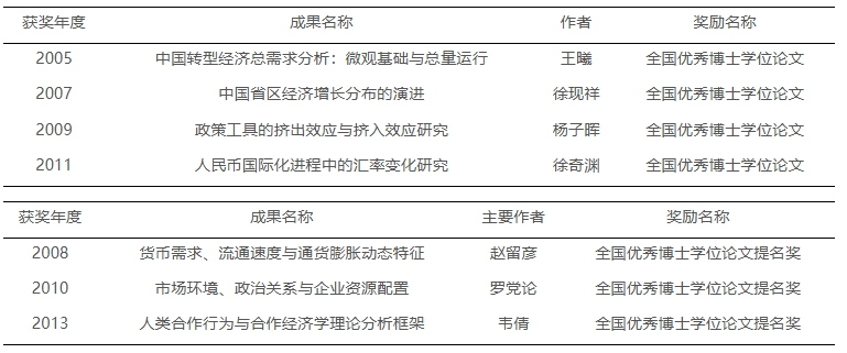 研究所研究员王曦、徐现祥、杨子晖和徐奇渊分别获得2005年、2007年、2009年和2011年全国百篇优秀博士论文奖。赵留彦、罗党论和韦倩分别获得2008年、2010年和2013年全国优秀博士学位论文提名奖。